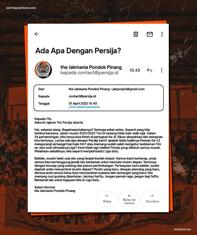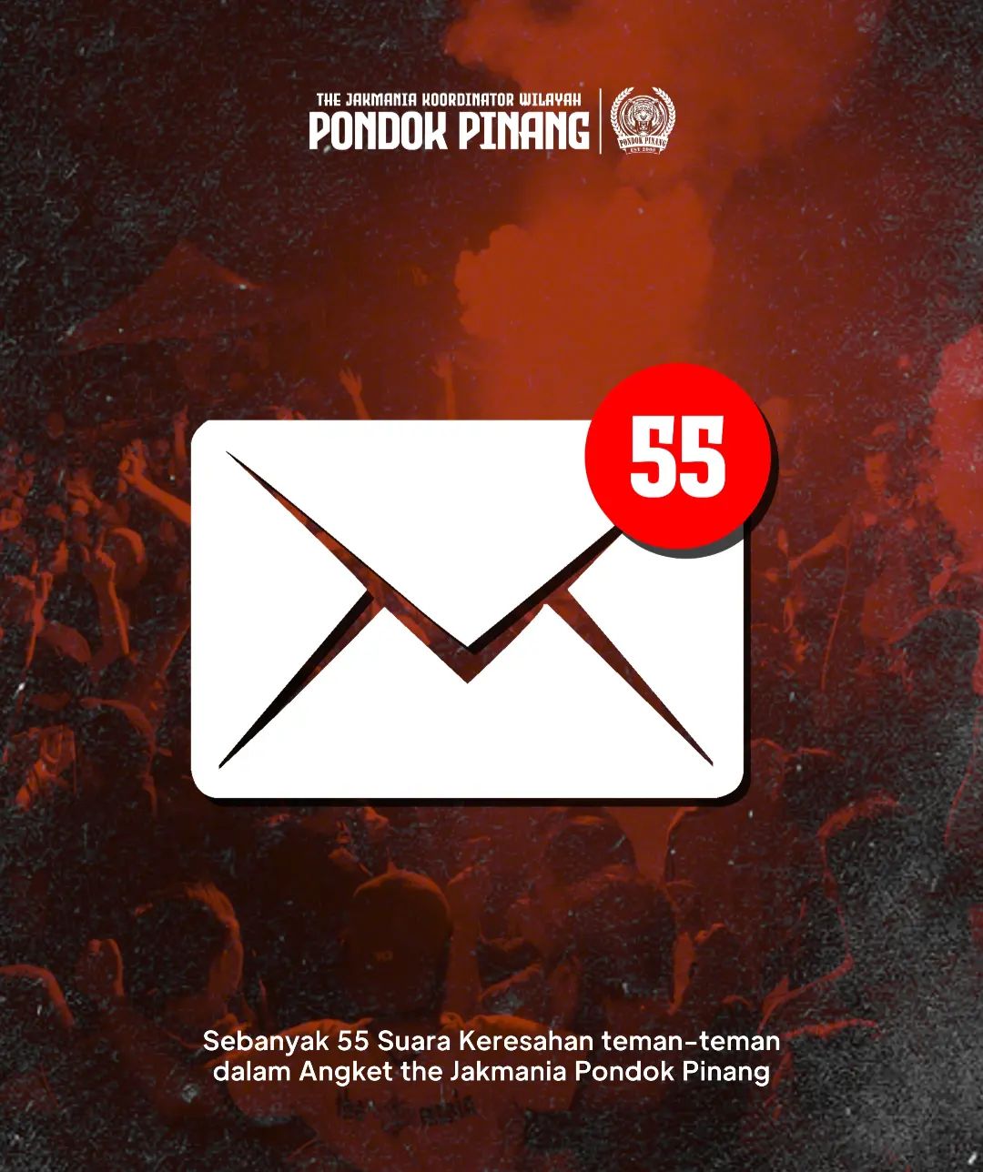 Sebanyak 55 suara keresahan dari teman-teman melaui angket dalam website resmi the Jakmania Pondok Pinang, yang dibuat pada tanggal 01 - 03 April 2022. Terimakasih untuk teman-teman yang memberikan suara tersebut, semoga tim Persija berada kembali dijalur yang semestinya._#Persija #MacanKemayoran#JakPondokPinang #ONEMI22ION